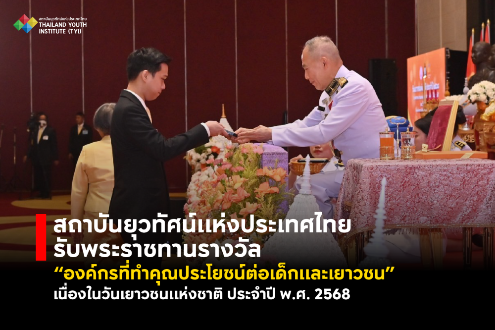 พระบาทสมเด็จพระเจ้าอยู่หัว ทรงพระกรุณาโปรดเกล้าโปรดกระหม่อมให้นายอำพน กิตติอำพน องคมนตรี เป็นผู้แทนพระองค์ พระราชทานรางวัล “องค์กรผู้ที่ทำคุณประโยชน์ต่อเด็กและเยาวชน” เนื่องในวันเยาวชนแห่งชาติ ประจำปี พ.ศ.2568 แด่ “สถาบันยุวทัศน์แห่งประเทศไทย” ในฐานะหน่วยงานที่มีบทบาทสำคัญร่วมกับสำนักงานกองทุนสนับสนุนการสร้างเสริมสุขภาพ (สสส.) ต่อการปกป้องคุ้มครองเด็กและเยาวชน จากภัยอันตรายของบุหรี่หรือบุหรี่ไฟฟ้า ส่งเสริมการใช้หมวกนิรภัยเพื่อลดอัตราการเสียชีวิตจากอุบัติเหตุ ทางถนนและส่งเสริมสุขภาวะทางเพศปลอดภัย โดยนายพชรพรรษ์ ประจวบลาภ เลขาธิการสถาบันยุวทัศน์แห่งประเทศไทย เป็นผู้แทนหน่วยงานเข้ารับพระราชทานรางวัลดังกล่าว โอกาสนี้นายอนุกูล ปีดแก้ว ปลัดกระทรวงการพัฒนาสังคมและความมั่นคงของมนุษย์ และนางอภิญญา ชมภูมาศ อธิบดีกรมกิจการเด็กและเยาวชนร่วมแสดงความยินดี